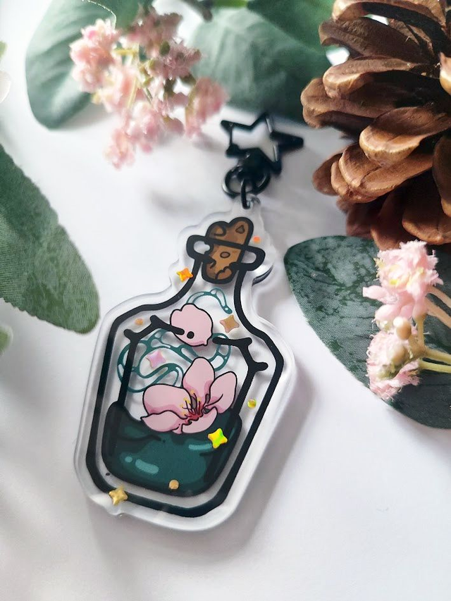 A pretty potion bottle design on clear acrylic with gold holographic stars and dots on one side. On the reverse is the same design but the stars and dots are in a gold print rather than holographic. The keychain is finished with a black star key fob ready to put on your keys or bag.